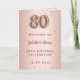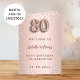 En falsk rose gold-gradientbakgrund med rosa diamanter. Namnet är skrivet med en modern, mörk rose gold-färgad handstilsmanuskript. Nummer 80 är skrivet med en ballongstil-font, skrivstil. Välkomsttext, foto, meny och ett tack-kort på baksidan.