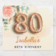 För en elegant och feminin 80-årsdag födelsedagsfest. En guldfärgad bakgrund. Dekorerad med en ro guld och en rosa vattenfärgad blomma, blommigt, grönt eucalyptus löv, spriter, grönsaks- och faux ro sprigs. Personalisera och namn. Svarta och gyllene brev. Namn är skrivet med ett modernt handskript i stil. Nummer 80 är skrivet med ett gyllene stil-typsnitt.