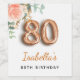 För en elegant och feminin 80-årsdag födelsedagsfest. En vit chic bakgrund. Dekorerad med en ro guld och en rosa vattenfärgad blomma, blommigt, grönt eucalyptus löv, spriter, grönsaks- och faux ro sprigs. Personalisera och namn. Svarta och gyllene brev. Namn är skrivet med ett modernt handskript i stil. Nummer 80 är skrivet med ett gyllene stil-typsnitt.
