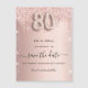 Ett giftigt och trendig Spara datumkortet för en 80:e födelsedagsfest. Ro guld övertoningsbakgrund som dekoreras med droppar och stoft från ro guld och faux silver glitter. Anpassa och lägg till datum och namn/text. Texten: Spara datumet skrivs med ett stort trendig-handskript i stil med dekortecken. Nummer 80 med ett stil-teckensnitt med ballong.
