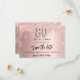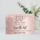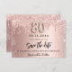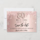 A Spara datum för en 80:e födelsedagsfest. Ro guld övertoningsbakgrund som dekoreras med dropparna ro guld och silver glitter. Anpassa och lägg till datum och namn/text. Texten: Spara datumet skrivs med ett stort trendig-handskript i stil med dekortecken. Nummer 80 med ett stil-teckensnitt med ballong.