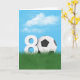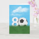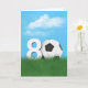 En svart och vit fotboll i grönt gräs, blå himmel och moln för en 80-årsdag. Ålder kan ändras och texten i kan redigeras.