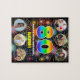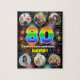Denna djärva och glatta födelsedagskalematerade pussel har nummer 80 med ett flerfärgat regnbågsspektrum inspirerat gradienten mönster, tillsammans med meddelandet LYCKLIG 80:e BIRTHDAY och anpassade namn, på ett mönster inspirerat av ett flerfärgat berömmande fyrverkeri. Nära överst och grund är bilder som kan vara personlig, kanske med foton av mottagaren och/eller mottagarens familj och vänner. Ett dystert pussel på personligens födelsedag som detta kan användas för att erkänna någons åttioårsdag. (Photography © Storytree Studios, Stanford, CA.) [~Z0000664]