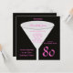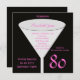 Detta 80:e födelsedagsfest inbjudan gjordes för kvinnor, eftersom det präglas av färg svart och shock rosa. Ett glas är fokuspunkten med namn i födelsedagsäln och födelsedagsfestens detaljer inuti. Numret 80 visas på högerna grund i shock rosa. Detta 80:e födelsedagsfest inbjudan är en mycket modern utformning för henne. Copyright henishouseofpaper