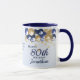 A stylish80th birthday mug . Design features navy blue and gold balloons, Gold glittery starts and navy blue text all on a pale blue gradient background. A lovely gift for an 80th birthday celebration. Easy to customize with your own details.