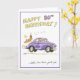 Roligt hälsningkort för den 80th födelsedagen. Dam i gammal bil med facklig jacksjaletttävla av som tycker om henne födelsedag.