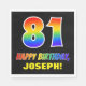 Den här roliga, roligt- och färgfulla pappra napkindesignen har ett stort nummer "81" och meddelandet "GRATTIS PÅ FÖDELSEDAGEN,", som båda har en regnbågsspektrumövertoning som inspirerade mönster, tillsammans med en fet gult anpassningsbar mottagare namn. Bakgrunden är svart på färgad. På födelsedagen kan pappra blöjor som denna användas vid ett party som firar någons 81-årsdag. [~Z0000476]