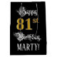 Den här presentsäcksdesignen i finare och den opulenta födelsedagsmatematiska formgivningen innehåller meddelandet "Lycklig 81:a födelsedagen", tillsammans med en anpassningsbar mottagare namn. En del av budskapet finns i en text som heter elegant-stil, det stora talet "81st" har ett faux/imitation guld-inspirerat utseende mönster, och bakgrunden är färgad svart. En vanlig presentsäck kan användas när en gåva eller present i firande av någons åttio första födelsedag är ge. [~Z0000560]