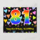 Framsidan av denna färgglada, roliga och kärleksfulla födelsedagskortdesign har en stor siffra "81" med ett regnbågsspektrum-gradering-mönster, tillsammans med meddelandet "Grattis på 81-årsdagen", och ett anpassningsbart mottagarnamn. Framsidan har dessutom ett livfullt och färgglatt mönster av kärleksfulla hjärtformer. Baksidan har ett anpassat födelsedagsmeddelande, eller kanske kan rensas och lämnas tomt om ett meddelande ska skrivas för hand istället. Ett personligt födelsedagskort som detta kan vara ett roligt sätt att skicka ett meddelande för att fira någon som fyller 81 år. Postkort som detta kan också användas för att inbjuda gäster till en födelsedagsfest som hålls för någon som fyller