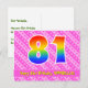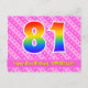Framsidan av denna glada och roliga födelsedagskortdesign har en stor siffra "81" med ett mönster inspirerat av regnbågens färgskala, tillsammans med meddelandet "Grattis på 81-årsdagen", och ett redigerbart namn på mottagaren. Framsidan har dessutom ett glatt ljust rosa och mörkt rosa randigt mönster med hjärtformer. Baksidan har ett anpassat födelsedagsmeddelande, eller kan rensas och lämnas tomt om ett meddelande ska skrivas för hand istället. Ett anpassningsbart födelsedagskort som detta kan vara ett roligt sätt att uppmärksamma någon på deras 81-årsdag. Kort som detta kan också användas för att inbjuda gäster till en födelsedagsfest eller firande som hålls för någon som fyller 81 år.