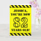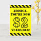 På framsidan av detta uppmärksammade och fetstilta gratulationskort med födelsedag finns en personlig namn och meddelandet "DU ÄR NU 82 ÅRS GAMLA!" i svart stencil inspirerade till text med gultens färgad. På framsidan finns också en svart och gult som flödar i öga upptill och i grund i kant. Insidan innehåller ett hälsning-meddelande från anpassningsbarnas födelsedag, eller kan kanske tas bort och lämnas tomt om ett meddelande ska skrivas för hand i stället. Ett sådant här födelsedagskort i personlig kan vara ett roligt för att skicka ett meddelande i firande om någons åttio andra födelsedag. [~Z0000413]