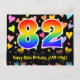 Framsidan av denna färgrika, kärleksfulla och spännande födelsedagstema vykort design har en stor siffra "82" med ett regnbågsspektrum gradient mönster, tillsammans med meddelandet "Grattis på 82-årsdagen," och ett redigerbart mottagarnamn. Framsidan har dessutom en livfull och färgrik bakgrund med ett mönster av kärleksfulla hjärtan. Baksidan har ett anpassat födelsedagsgratulationsmeddelande, eller kanske kan rensas och lämnas tomt om ett meddelande ska skrivas för hand istället. Ett födelsedags vykort som detta kan vara ett roligt sätt att skicka födelsedagsönskningar till någon som firar sin åttioandra födelsedag. Vykort som detta kan också användas för att bjuda in gäster till en födels