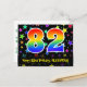 Framsidan av denna färgglada, roliga och spännande födelsedagstema postkortsdesign har en stor siffra "82" med ett regnbågsspektrum-gradering inspirerat mönster, tillsammans med meddelandet "Grattis på 82-årsdagen", och ett redigerbart mottagarnamn. Framsidan har dessutom ett livfullt och färgglatt bakgrundsmönster med stjärnformer i olika storlekar. Baksidan har ett anpassat födelsedagsmeddelande, eller kanske kan rensas och lämnas tomt om ett meddelande ska skrivas för hand istället. Ett anpassningsbart födelsedagskort som detta kan vara ett roligt sätt att skicka ett meddelande för att fira någon:s åttioandra födelsedag. Postkort som detta kan också användas för att bjuda in gäster till en f