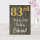 Den här snyggten, sofistikerad och elegantens hälsningskortdesign har ett stort ordnummer "83:e" som har en imitation/faux guld-liknande gradient mönster, utöver födelsedagstecknet "Lycklig 83:e födelsedagen" och ett anpassade namn i ett skript-hälsning-teckensnitt på framsidan. Den har också en fingerad träinspirerad bakgrund mönster på framsidan. Insidan har ett hälsning-meddelande på personligens födelsedag, eller kan kanske tas bort och lämnas tomt om ett meddelande ska skrivas för hand i stället. Ett lyxigt hälsningskort för personliger som detta kan användas för att fira någons åttiotredje födelsedag. [~Z0000519]