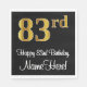 Den här snyggten har en lyxig och sofistikerad papper napkindesign med ett stort ordnummer "83:e" som har ett utseende som präglas av faux/imitation guld, plus hälsning-födelsedagsmeddelandet "Lycklig 83:e födelsedagen" och en namn personlig i ett skript-stil-teckensnitt. Den har också en bakgrund med svart färgad. Pappra servetter som den här kan användas i party för någon som firar sin åttiotredje årsdag. [~Z0000516]