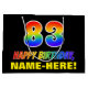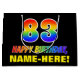 Den här roligten, som är färgstark och rolig, har ett stort nummer "83" och "GRATTIS PÅ FÖDELSEDAGEN", som båda har en regnbågsspektrumövertoning som inspirerar mönster-färgning, tillsammans med en fet gult-anpassade-mottagare namn. Bakgrunden är svart på färgad. En sådan här presentpåse på roligtens födelsedag kan användas när en gåva eller present i firande på någons åttio tredje födelsedag är ge. [~Z0000477]