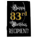 Den här portalens och den här komplimangens presentsäcksdesign för födelsedagspressen innehåller meddelandet "83:e födelsedagen, Lycklig", plus en redigerbar mottagare namn. En del av budskapet finns i en lyxig text med skript-stil. Det stora antalet "83:e" har ett faux/imitation guld-inspirerat utseende mönster. Bakgrunden är svart på färgad. En presentpåse som denna kan vara ett respektabelt sätt att fylla en födelsedagspresent eller gåva som ges till någon som firar sin 83-årsdag. [~Z0000560]