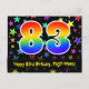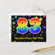 Framsidan av denna roliga, spännande och färgglada födelsedagstema postkortsdesign har en stor siffra "83" med ett regnbågsspektrum-gradering inspirerat mönster, tillsammans med meddelandet "Grattis på 83-årsdagen", och ett anpassningsbart mottagarnamn. Framsidan har dessutom ett färgglatt och livfullt stjärnformigt bakgrundsmönster. Baksidan har ett redigerbart födelsedagsmeddelande, eller kanske kan rensas och lämnas tomt om ett meddelande ska skrivas för hand istället. Ett personligt födelsedagskort som detta kan vara ett roligt sätt att fira någon på deras åttiotredje födelsedag. Postkort som detta kan också användas för att bjuda in gäster till en födelsedagsfest som hålls för någon som