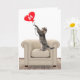 Tabby katt står på en beige läderstol och leker med en röd hjärtballong i 84 år.
