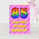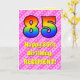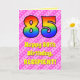 Framsidan av den här uppslagna och glada 85-årsversionen av hälsningskortet har ett stort nummer "85" med ett färgstarkt regnbågsspektrum som inspirerar gradienten mönster. Det innehåller också budskapet "85:e födelsedagen i Lycklig" och en redigerbar mottagare av namn. Bakgrunden till framsidan har en mörk rosa och ljus rosa rand mönster som innehåller levande hjärthjälpformer av rosa. Insidan innehåller ett hälsning-meddelande från personligens födelsedag, eller kan kanske tas bort och lämnas tomt om ett meddelande ska skrivas för hand i stället. Ett sådant här födelsedagskort i personligen kan vara ett roligt sätt att skicka önskemål till någon som firar sin åttiofemte födelsedag. [~Z0000416]