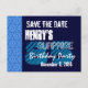 Här är en trendig "save the date"-design för en ÖVERRASKNINGS-födelsedagsfest på 85 år, ett blått geometriskt mönster med accentfärger i midnatt, marinblått och vitt. Modern och elegant!