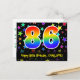 Framsidan av denna färgglada, spännande och roliga födelsedagsteman postkortsdesign har en stor siffra "86" med ett regnbågsspektrum-gradering inspirerat mönster, tillsammans med meddelandet "Grattis på 86-årsdagen", och ett anpassat mottagarnamn. Framsidan har dessutom ett färgglatt och livfullt stjärnformsmönster i bakgrunden. Baksidan har ett anpassat födelsedagsmeddelande, eller kan kanske rensas och lämnas tomt om ett meddelande ska skrivas för hand istället. Ett anpassningsbart födelsedagskort som detta kan vara ett roligt sätt att uppmärksamma någon på deras åttiosjätte födelsedag. Postkort som detta kan också användas för att inbjuda gäster till en födelsedagsfest eller kalas som