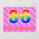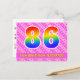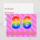 Framsidan av denna kärleksfulla, upprymda och glada födelsedagstema postkort visar ett stort nummer "86" med ett regnbågsspektrum-gradering inspirerat mönster, tillsammans med meddelandet "Grattis på 86-årsdagen," och ett anpassningsbart mottagarnamn. Framsidan har dessutom ett glatt ljust rosa och mörkt rosa randigt mönster med hjärtformer. Baksidan visar ett personligt födelsedagsmeddelande, eller kan raderas och lämnas tomt om ett meddelande ska skrivas för hand istället. Ett personligt födelsedagskort som detta kan vara ett roligt sätt att fira någon på deras åttiosjätte födelsedag. Postkort som detta kan också användas för att bjuda in gäster till en födelsedagsfest eller firande som hålls för någon som fyller