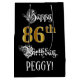 Den här detaljerade och opulenta presentsäcksdesignen för födelsedagspressar innehåller meddelandet "Lycklig 86:e födelsedagen", plus ett anpassade som tar emot namn. En del av budskapet finns i en lyxig text med skript-stil, det stora talet "86:e" har ett faux/imitation-inspirerat utseende mönster, och bakgrunden är färgadens svarta. En presentpåse som denna kan användas när en gåva eller present ge till heder för någons åttiosjätte födelsedag. [~Z0000560]