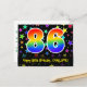 Framsidan av denna färgglada, spännande och roliga födelsedagstemanade vykortdesign har en stor siffra "86" med ett regnbågsspektrum-gradering inspirerat mönster, tillsammans med meddelandet "Grattis på 86-årsdagen", och ett anpassat mottagarnamn. Framsidan har dessutom ett färgglatt och livfullt stjärnformsmönster i bakgrunden. Baksidan har ett anpassat födelsedagsmeddelande, eller kan kanske rensas och lämnas tomt om ett meddelande ska skrivas för hand istället. Ett anpassningsbart födelsedagsvykort som detta kan vara ett roligt sätt att uppmärksamma någon på deras åttiosjätte födelsedag. Vykort som detta kan också användas för att inbjuda gäster till en födelsedagsfirande eller