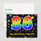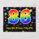 Framsidan av denna färgglada, spännande och roliga födelsedagstemanade vykortdesign har en stor siffra "86" med ett regnbågsspektrum-gradering inspirerat mönster, tillsammans med meddelandet "Grattis på 86-årsdagen", och ett anpassat mottagarnamn. Framsidan har dessutom ett färgglatt och livfullt stjärnformsmönster i bakgrunden. Baksidan har ett anpassat födelsedagsmeddelande, eller kan kanske rensas och lämnas tomt om ett meddelande ska skrivas för hand istället. Ett anpassningsbart födelsedagsvykort som detta kan vara ett roligt sätt att uppmärksamma någon på deras åttiosjätte födelsedag. Vykort som detta kan också användas för att inbjuda gäster till en födelsedagsfirande eller