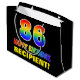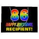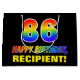 Den här roligten, den roliga och färglösa presentväskan har ett stort nummer "86" och meddelandet "GRATTIS PÅ FÖDELSEDAGEN,", båda färgader med en regnbågsspektrumövertoning inspirerade mönster, tillsammans med en fet gult anpassade mottagare namn. Bakgrunden är svart på färgad. En sådan här presentpåse på roligtens födelsedag kan användas för att figurera en gåva eller present som ges för att fira någons åttiosjätte födelsedag. [~Z0000477]