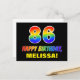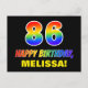 Framsidan av denna beundransvärda, färgstarka och roligtens vykortsdesign har ett stort nummer "86" och meddelandet "GRATTIS PÅ FÖDELSEDAGEN", båda färgader med en regnbågsspektrumövertoning inspirerade mönster, tillsammans med en fet gult anpassningsbar mottagare namn. På framsidan finns också en enkel, minimal, svart färgad. Baksidan av vykortet har ett redigerbart hälsning-födelsedagsmeddelande, eller så kan det kanske raderas och lämnas tomt om ett meddelande ska skrivas för hand i stället. Ett färgstarkt vykort för personligens födelsedag som detta kan vara ett roligt för att erkänna någons åttiosjätte födelsedag. [~Z0000474]