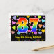 Framsidan av denna roliga, färgglada och spännande födelsedagstemanpassade vykortdesign har en stor siffra "87" med ett regnbågsspektrum-gradering-inspirerat mönster. Den har också meddelandet "Grattis på 87-årsdagen," och ett anpassat mottagarnamn. Framsidan har dessutom ett färgglatt och livfullt mönster av kärleksfulla hjärtan. Baksidan har ett redigerbart födelsedagsgratulationsmeddelande, eller kan eventuellt rensas och lämnas tomt om ett meddelande ska skrivas för hand istället. Ett personligt födelsedagsvykort som detta kan vara ett roligt sätt att skicka ett meddelande för att fira någon:s åttiosjunde födelsedag. Vykort som detta kan också användas för att inbjuda gä