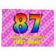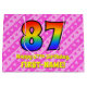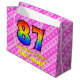 Den här roligten och den kommande 87-årsdagen av presentsäcksdesignen har ett stort nummer "87" med ett regnbågsspektrum som inspirerar till gradient mönster. Det innehåller också budskapet "Lycklig 87:e födelsedag" och en personlig namn. Bakgrunden har en rosa i mörk och ett mönster i ljusa rosa rand som innehåller levande hjärtformer i rosa. Sådana presentsäckar kan användas när man slår in presenter eller när man ger presenter för att fira någons åttio sjunde födelsedag. [~Z0000414]