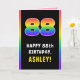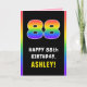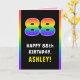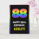 Det här uppsvällda och feta födelseteckendesignen har numret "88", som har ett regnbågsspektrum som inspirerar multifärgaden mönster, tillsammans med meddelandet "LYCKLIG 88:e BIRTHDAY", och anpassadet namn. Insidan har ett anpassat hälsning-födelsedagsmeddelande, eller så kan det kanske rensas och lämnas tomt om ett meddelande ska skrivas för hand i stället. Ett sjudande födelsedagskort som detta kan vara ett roligt för att skicka ett hälsning-födelsedagsmeddelande till någon som firar sin åttioåttonde födelsedag. [~Z0000636]