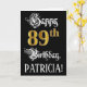 Framsidan av denna lyxiga och elegant-matematiska hälsningskort innehåller meddelandet "Lycklig 89:e födelsedag" och en anpassningsbar mottagare namn. En del av budskapet finns i en utförlig text med skript-stil, det stora talet "89:e" har ett faux/imitation guld-inspirerat utseende mönster, och bakgrunden är färgadens svart. Insidan har ett redigerbart hälsning-födelsedagsmeddelande, eller så kan det kanske rensas och lämnas tomt om ett meddelande ska skrivas för hand i stället. Ett lavish, anpassat födelsedagskalenderkort som detta kan skickas för att fira någons åttionionde födelsedag. [~Z0000559]