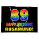 Den här roligten, den roliga och färgstarka presentsäcksdesignen på födelsedagen har ett stort nummer "89" och meddelandet "GRATTIS PÅ FÖDELSEDAGEN,", båda färgader med en regnbågsspektrumövertoning inspirerade mönster, tillsammans med en djärv gult redigerbar mottagare namn. Bakgrunden är svart på färgad. En roligt presentsäck av det här slaget kan användas när man slår in gåvor som ges till någon i firande på 89-årsdagen. [~Z0000477]