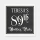Den här pappra napkin-designen för finare och den opulenta födelsedagen har en personlig namn och meddelandet "89:e Födelsedagsfesten". Det stora antalet "89:e" och ord "Födelsedagsfest" står i lyxig text med skript-stil. Bakgrunden är färgadens svarta som standard (även om den kan anpassas). Finare, så här utvecklade pappra blöjor kan vara användbara vid en födelsedagsfest/firande som hålls för att fira någons åttionionde födelsedag. [~Z0000563]