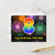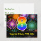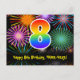 Framsidan av denna färgglada, spännande och roliga födelsedagstematiska postkortsmall har en stor siffra "8" med ett regnbågsspektrum-gradering-mönster, tillsammans med meddelandet "Grattis på 8-årsdagen", och ett redigerbart mottagarnamn. Framsidan har dessutom ett livfullt och färgglatt bakgrundsmönster inspirerat av utseendet på sprängande festliga fyrverkerier. Baksidan har ett anpassningsbart födelsedagsmeddelande, eller skulle kunna rensas och lämnas tomt om ett meddelande ska skrivas för hand istället. Ett personligt födelsedagskort som detta kan vara ett roligt sätt att skicka ett meddelande för att fira någon som fyller åtta år. Postkort som detta kan också användas för att inbjuda gäster till en