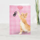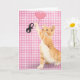 Guld tabby katt med rosa hjärtballong för åtta års födelsedag på rosa och vit gingham-bakgrund.