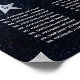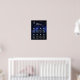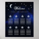 En 8 bord bröllop placeringsplan för ett himmelskt bröllopstema, med månen och stjärnan på en stjärnklar blå bakgrund. Bordnumren är skrivna i stora silvergrå stjärnor. Månen, stjärnorna och ordet Välkommen (skrivet i en elegant kalligrafisk stil) är silvergrå, resten av texten är vit.