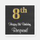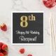Denna lyxiga, sofistikerade och pappra napkin-design för eleganten har ett stort ordnummer "8th" som har ett imitation/faux guld-liknande utseende, plus hälsning-födelsedagsmeddelandet "Lycklig 8:e födelsedag" och ett anpassat namn i ett typsnitt av typen script-stil. Bakgrunden är svart på färgad. Pappra servetter som denna kan användas när man firar någons åttonde födelsedag. [~Z0000516]