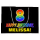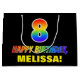 Den här färgstarka, roligt- och fjällande presentsäcksdesignen har ett stort nummer "8" och meddelandet "GRATTIS PÅ FÖDELSEDAGEN", som båda har en regnbågsspektrumövertoning som inspirerade mönster-färgning, tillsammans med en fet gult anpassningsbar-mottagare namn. Bakgrunden är svart på färgad. En sådan här presentpåse på roligtens födelsedag kan användas när en gåva eller present i firande på någons åttonde födelsedag är ge. [~Z0000477]