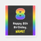 Den här pappra napkin-designen för roligt och glatt födelsedag innehåller siffran "8" med ett regnbågsspektrum som inspirerar multifärgaden mönster, tillsammans med meddelandet "Lycklig 8:e födelsedag" och en redigerbar mottagare av namn. Den pappra blöjan kan användas vid en födelsedagsfest i firande på någons åttonde födelsedag. [~Z0000629]