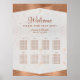 I detta sittdiagram för bröllop med 8 bord kombineras trender för många 2019: geometrisk, marmor, metallisk (koppar) och speciellt typsnitt (ett kalligrafiskt elegant). Bakgrunden är vit marmor. På gräns uppåt och nedåt finns faux metallisk koppar, som bildar vinklar och en oregelbunden sexhörning av vita marmor. Namnen för bruden och trimmen och titeln Välkomna skrivs i ett elegant kalligrafiskt skript. All text har en rödbrun färg, som kopparen.
