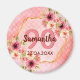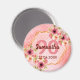 En trendig och flickaktig magnet för en 90-årsfest. Med en falsk guld hexagon geometrisk formad ram. Dekorerad med akvarellfärgade dahliablommor i rosa, kräm och korall. Levande korallfärgad bakgrund med prickar. Mallar för namn, ålder 90 och datum. Födelsedatum eller datum för festen. Vinröda och korallfärgade bokstäver. Perfekt som en souvenir, minnessak eller "spara datum"-påminnelse för dina gäster.
