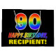 Den här roligten, den roliga och färglösa presentväskan har ett stort nummer "90" och meddelandet "GRATTIS PÅ FÖDELSEDAGEN,", som båda har en regnbågsspektrumövertoning som inspirerade mönster-färgning, tillsammans med en fetstilt gult som kan redigeras av namn. Bakgrunden är svart på färgad. En roligt presentsäck av det här slaget kan användas när man slår in presenter som ges till någon i firande på 190-årsdagen. [~Z0000477]