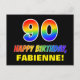 Framsidan av detta roliga, roligt- och färgstarka vykort för födelsedagskalender har ett stort nummer "90" och meddelandet "GRATTIS PÅ FÖDELSEDAGEN,", båda färgader med en regnbågsspektrumövertoning inspirerade mönster, tillsammans med en djärv gult redigerbar mottagare namn. På framsidan finns också en minsta bakgrund för svart färgad. Baksidan av vykortet innehåller ett redigerbart födelsedagsmeddelande hälsning, eller så kan det kanske raderas och lämnas tomt om ett meddelande ska skrivas för hand i stället. Ett sådant här muntert vykort för personligens födelsedag kan vara ett roligt för att fira någons nittioårsdag. [~Z0000474]