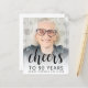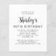 På framsidan av den här 90:e födelsedagsinbjudan finns en bild från hedersgästen med ett svart textöverlägg. "cheers" i ord visas i elegantens kalligrafskript, följt av "till 90 år" och gästen för hedersans namn och födelsedag i sans serif font. Ett vitt skärm hjälper till att göra så att texten visas. Anpassa baksidan med namn och party på vit bakgrund. Ett underbart sätt att fira någon som blir nittio! (Obs! Kuvert inkluderas inte automatiskt i den här budgetinbjudan. Om du vill lägga till kuvert i din beställning användor du listrutan "Kuvert".)