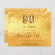 Ett giftigt och trendig Spara datumkortet för en 90:e födelsedagsfest. En modern faux-metallisk tittar i guld, dekorerad med faux glitter drops, färgdroppstift. Anpassa och lägg till ett datum och namn. Texten: Spara datumet skrivs med ett stort trendig-handskript i stil. Nummer 90 med ett stil-teckensnitt med ballong.